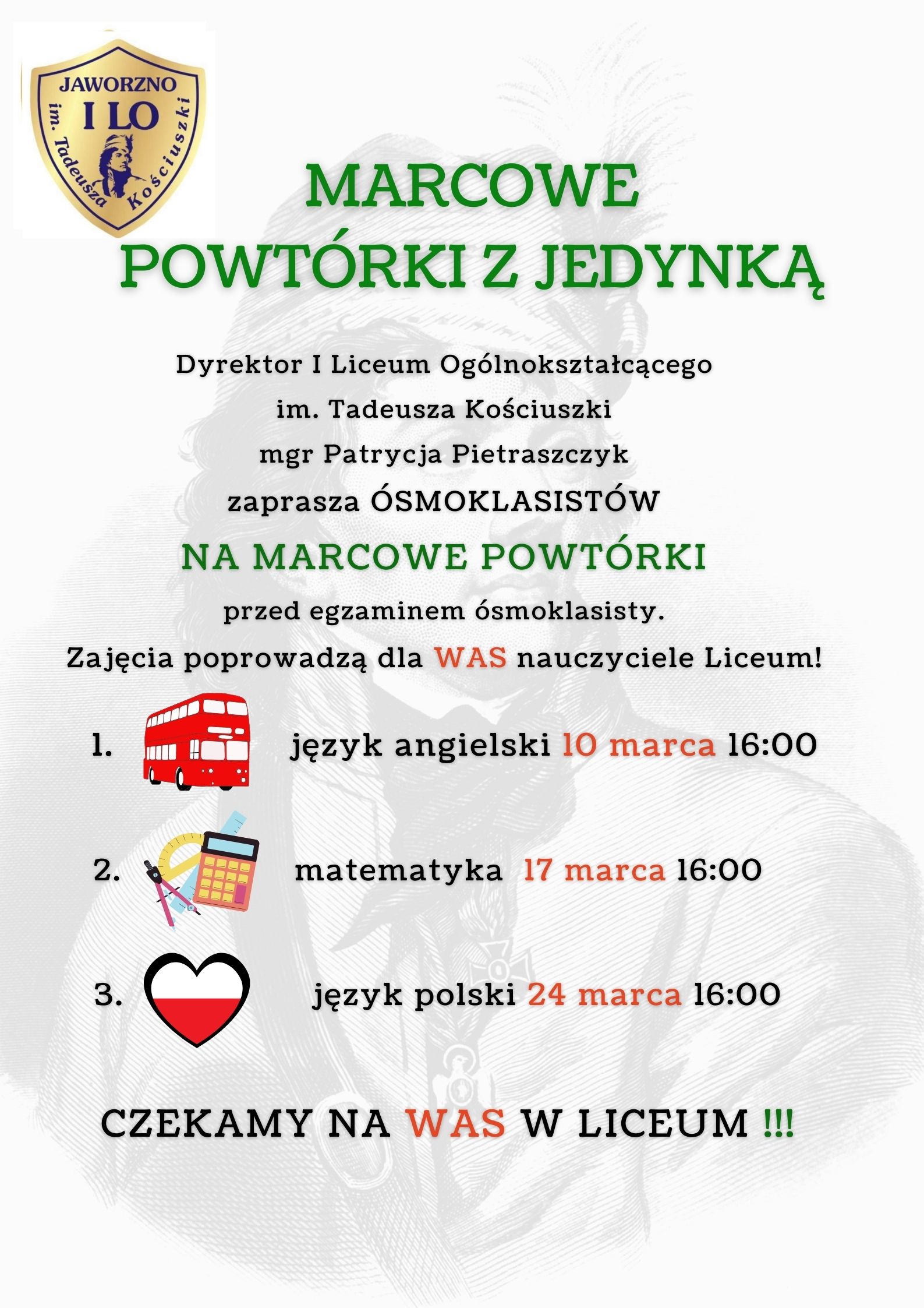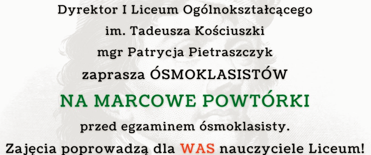 Dyrektor I Liceum Ogólnokształcącego wraz z nauczycielami zaprasza ósmoklasistówna coroczne powtórki przed egzaminem ósmoklasisty:„MARCOWE POWTÓRKI Z JEDYNKĄ”.