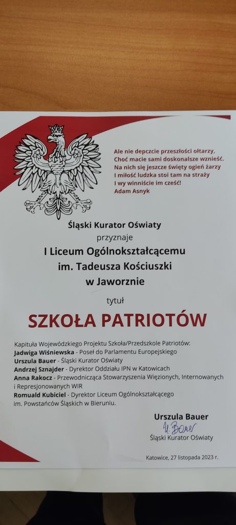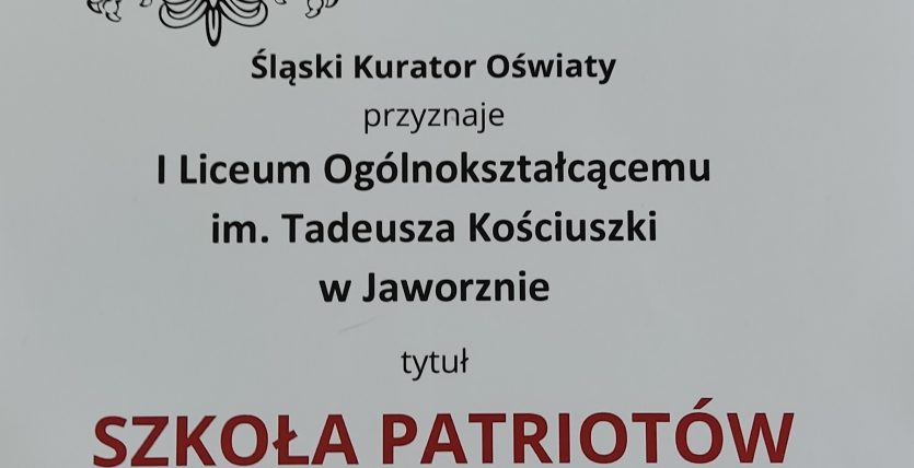 Uzyskanie certyfikatu SZKOŁY PATRIOTÓW było zwieńczeniem kilku miesięcy wytężonej pracy. Nie było łatwo, wykonaliśmy wiele zadań, od tych dydaktycznych do poznawania miejsc związanych z JANKIEM MARTYNIAKIEM na terenie naszego miasta. W realizację tych działań najbardziej byli zaangażowani uczniowie z klasy 3a, 2c, 2d. Podkreślić należy, że jesteśmy jedyną szkołą ponadpodstawową z terenu Jaworzna, która wywalczyła ten zaszczytny tytuł.